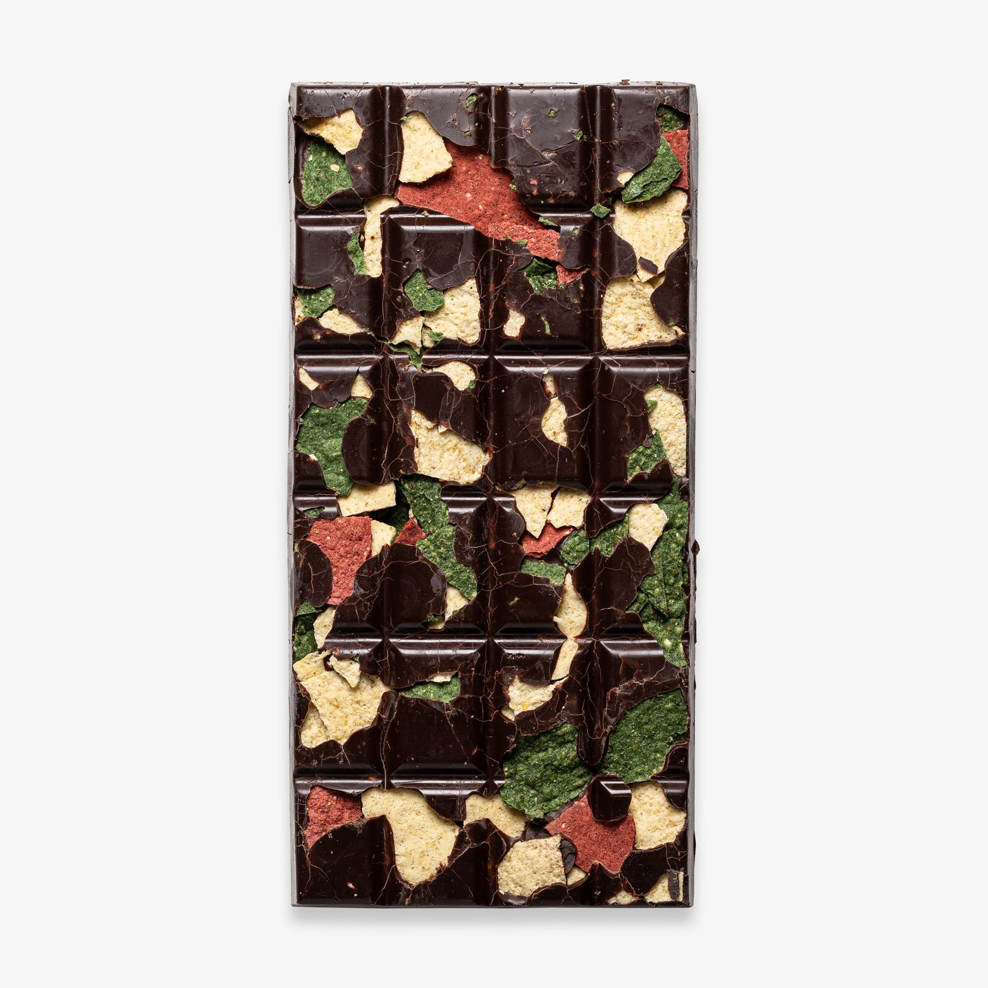 Ingredients: Cocoa mass, sugar, cocoa butter , emulsifier: soy lecithin, natural vanilla flavouring, tri colour tortilla chips, new mexico chilli powder, chilli flake powder. Manufactured in a facility that also handles tree nuts, peanuts, gluten, soy & dairy
